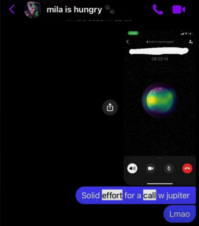 A conversation between Shan and her friend. Shan shares a screenshot of the duration of a call with Jupiter that lasted 8 hours, 23 minutes and 14 seconds.