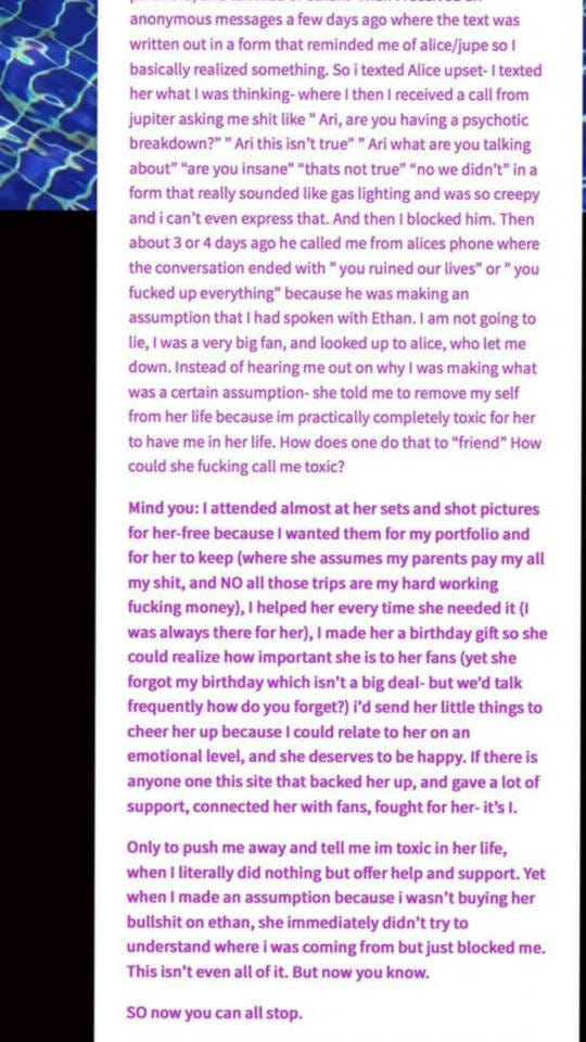 Prior to crystalfakecastles, someone named Ari would promote an anti-Ethan movement across social media platforms, helping to spread false information about Ethan at Alice & Jupiter’s request. When speaking about her situation with them, she revealed a similar experience as to what I went through: