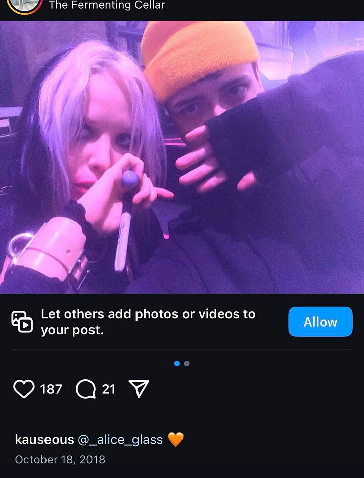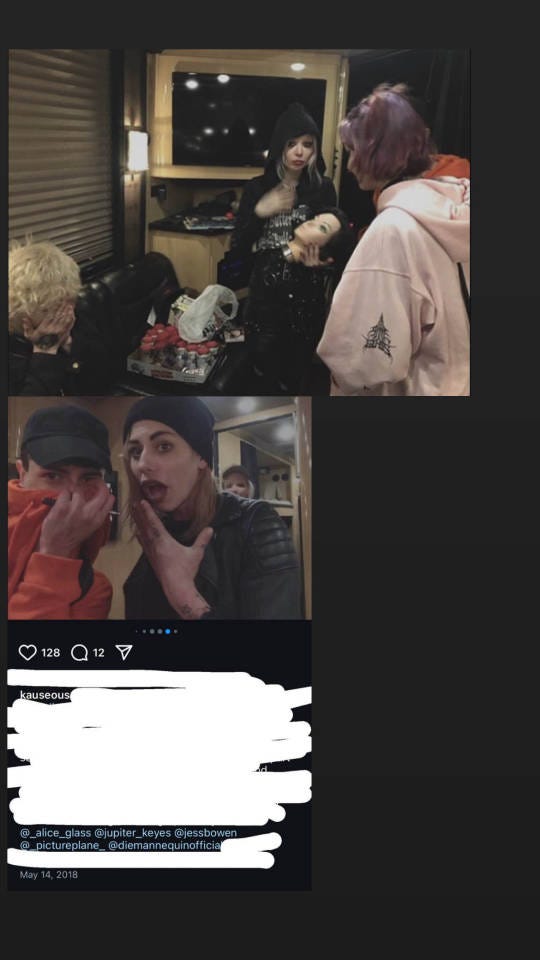 In May 2018 I met Alice and Jupiter for the first time, me and my friend Rhi were brought backstage by Jupiter. Before meeting the tour crew, Jupiter brought out weed and alcohol for me & Rhi to take before we hung out for a couple of hours backstage at the venue until we moved to Alice’s tour bus after the closing staff asked us to leave. I was extremely grateful for these opportunities so I never questioned anything that seemed off. I hung out backstage with Alice again in October 2018, a strange pattern I noticed from the times we hung out was that with Jupiter around she would act timid but whenever he’d leave the room she would interact with more of a display of personality.