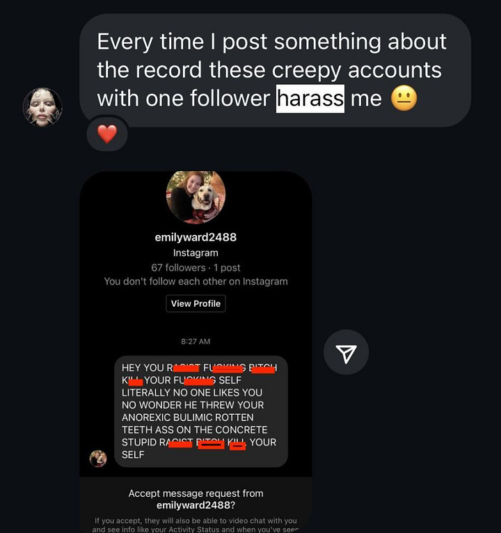 As the drama in the fandom worsened, it led to me and some friends, that I met in the Crystal Castles community named Rhi & Leo, being falsely accused as being the owners of the crystalfakecastles Tumblr with attempts of people trying to dox our private information. I was led to believe that the online harassment towards us was being done by Ethan and his “bot accounts”, as Jupiter & Alice refer to it, this only led me deeper into Alice & Jupiter’s manipulation and made me even more fearful of Ethan.