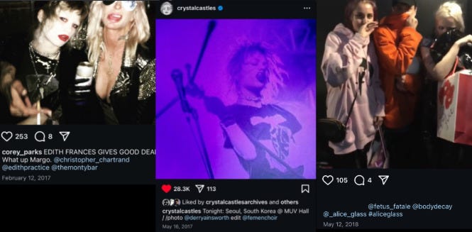 Aside from “Untitled Profile”, you might remember me by my older usernames like “bodydecay” and “fetus_fatale”. When I began posting Amnesty era Crystal Castles edits on my page after years of not doing so, I mentioned that I couldn’t continue being guilt-tripped and brainwashed by people about what I can or can’t support anymore, the people I was referring to were Alice Glass & Jupiter Keyes. Getting in close contact with them all started back in fall 2016 when I first made an Instagram account, I’d post myself and random stuff which at times included edits of Crystal Castles members (Edith Frances, Alice Glass & Ethan Kath) that I made, Alice acknowledged some of these edits and would compliment them but didn’t like that I would create edits of Edith.
