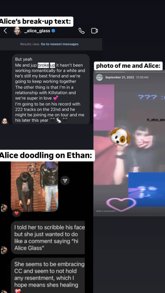 In July 2022 Alice told me she broke up with Jupiter a while back. During her time away from Jupiter, Alice began reposting Crystal Castles edits, watching old Crystal Castles performances in her hotel room while posting clips that included Ethan in them & even doodling chat bubbles saying “”♥‿♥ Hi Alice Glass!” over Ethan when signing Crystal Castles albums for fans, I found this sort of behaviour to be strange as it did not align with the constant fear of Ethan she allegedly lived in, seeing her playing around with whom she claimed as her abuser made me extremely uncomfortable and doubtful about everything she ever told me.