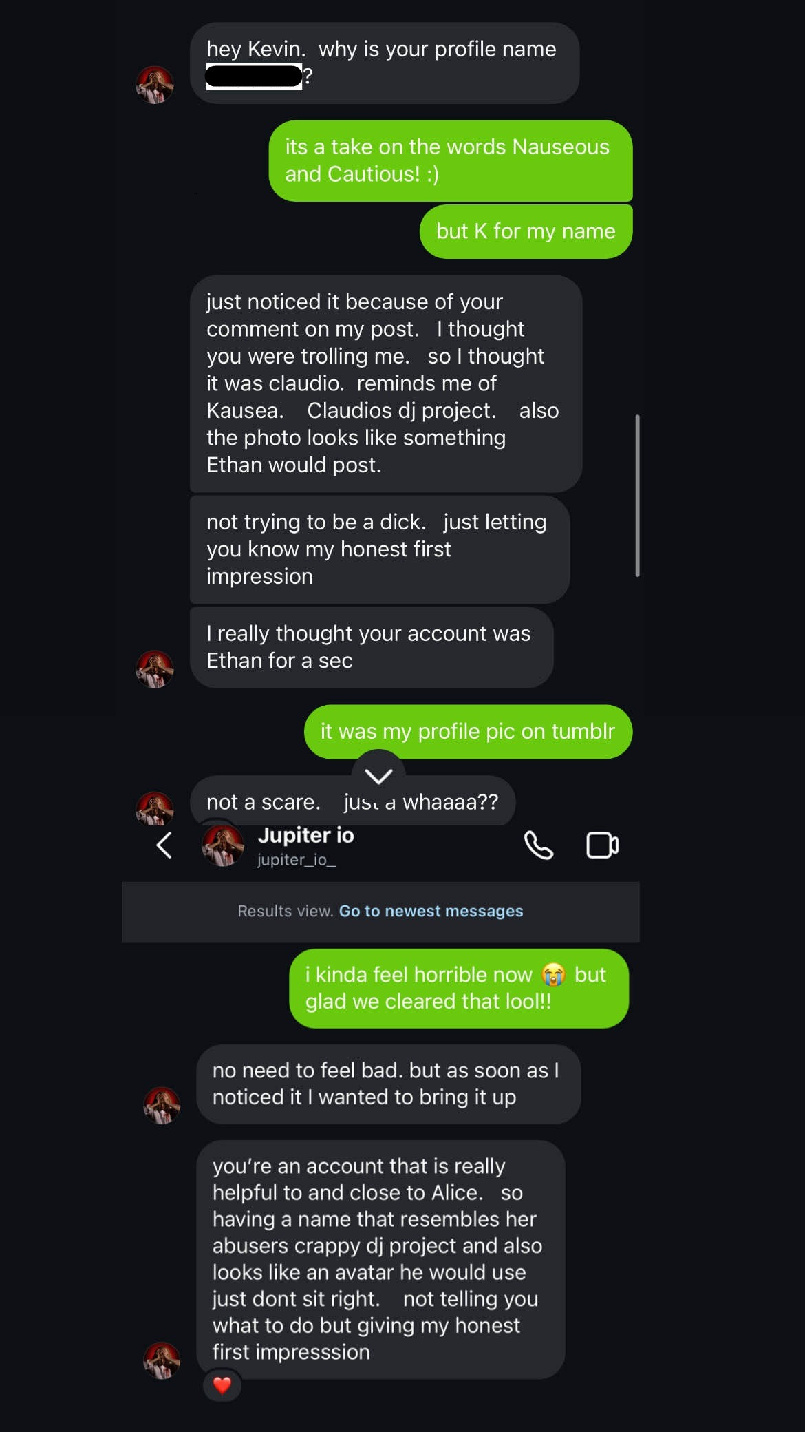 Here’s 1 of many examples of Jupiter acting very strange towards me, in late November 2021 Jupiter questioned why I changed my username and profile picture (man in a skimask) to something that he found was too close in resemblance to Ethan’s scrapped stage name “Kausea” and to his aesthetic, I changed my username at his request but shortly after I changed it back because it bothered me that he thought he had a say in how I presented myself regardless of anything, this is just a peek of how controlling Jupiter can be towards others around him. Alice didn’t care about this situation whatsoever, this only bothered Jupiter.