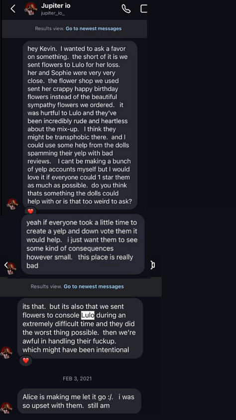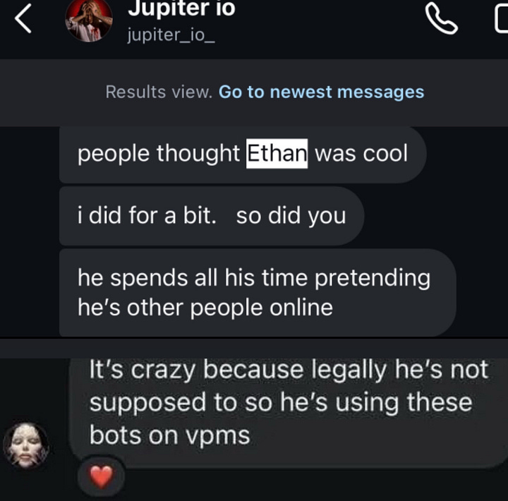 By late October 2020 “fetus_fatale” was deleted, I also deleted my tumblr to further distance myself from everything. I told Jupiter my accounts were wrongfully terminated so that he wouldn’t accuse me of being controlled by Ethan because I knew that’s where his mind would go, all I truly wanted was to be a fan and to stop being questioned by them but I would continue to be reeled in. Jupiter blamed Ethan for deleting my accounts because Ethan is the scapegoat that they place the blame on everything for. Jupiter suggested multiple methods to recover my accounts and said that with Alice’s help I could possibly get them back but thankfully the conversation died out.