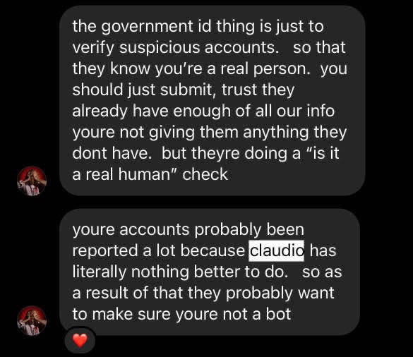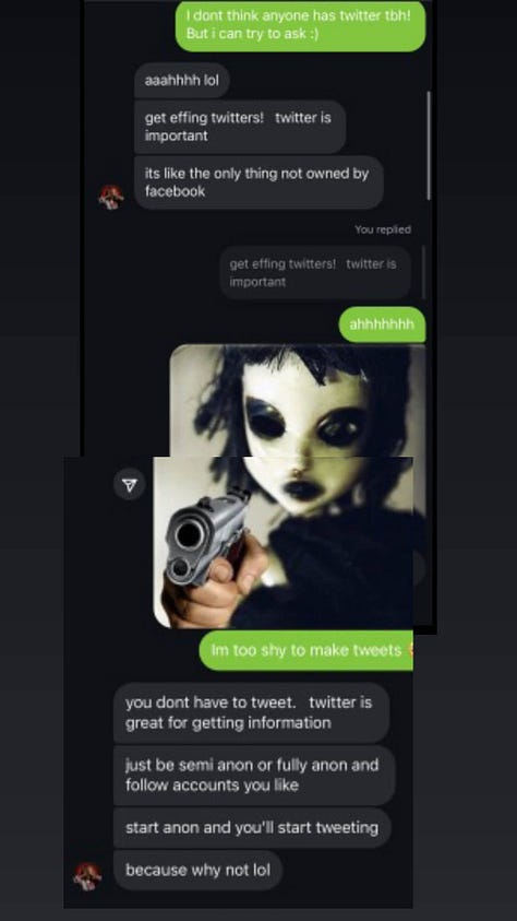 [At this point we mainly spoke through my fetus_fatale account but also at times on my personal page so it was back & forth between those 2 accounts so unfortunately I’m unable to attach screenshots that would involve the fetus_fatale account as it has been deleted for years now.]