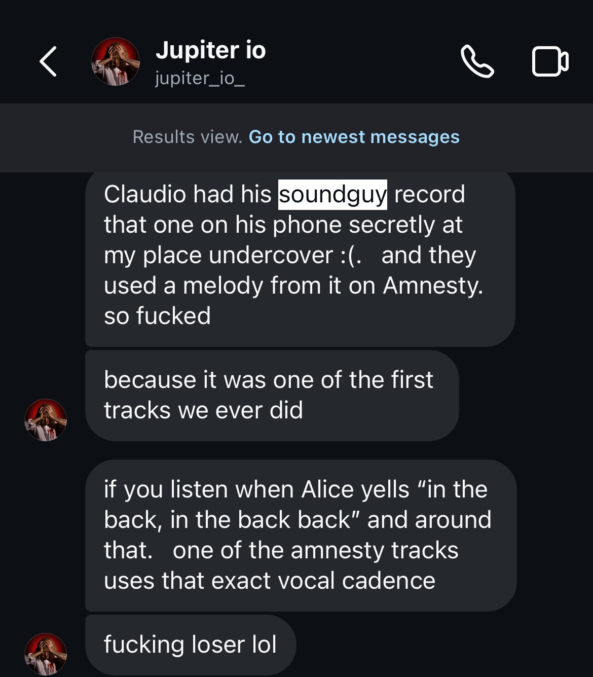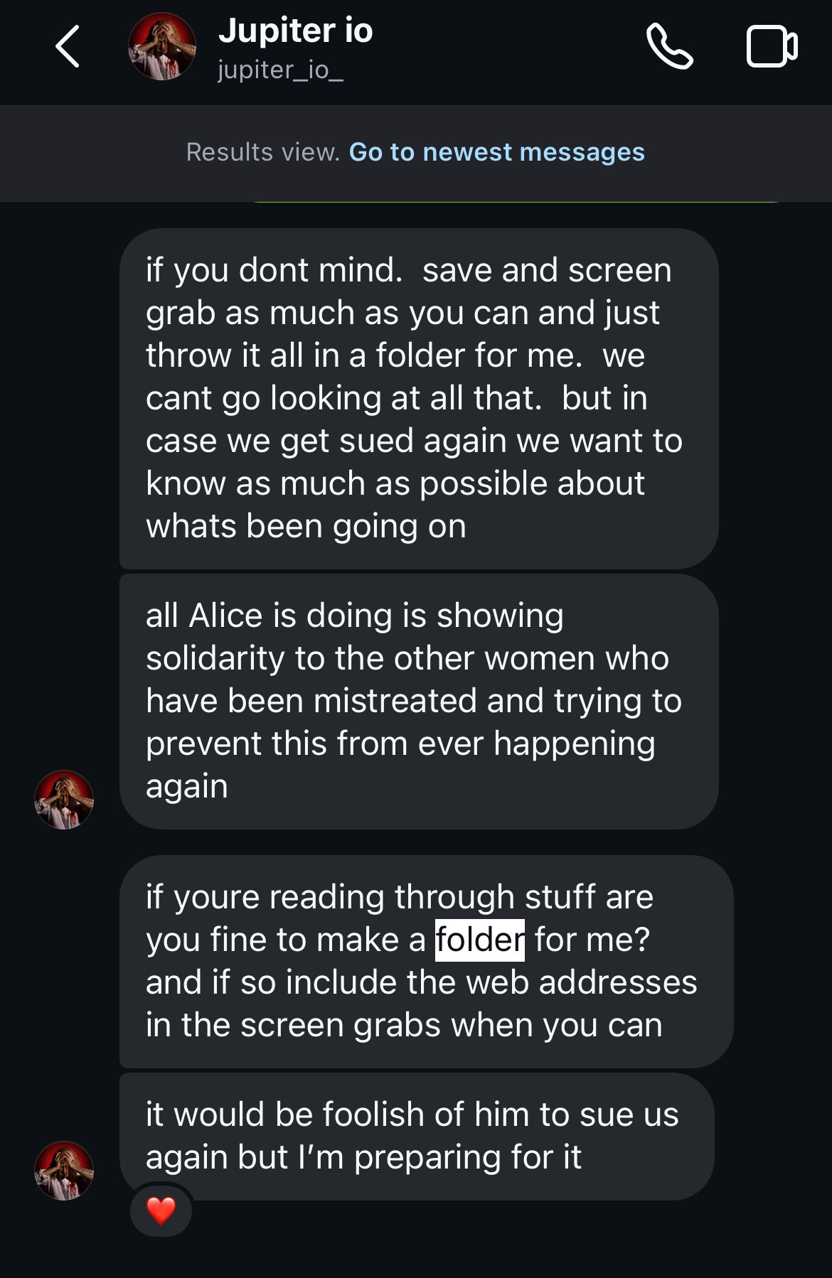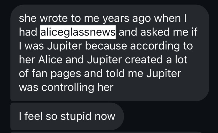 Anyways, all of this fucked with my head for a very long time and there are many more reasons why my thoughts on everything has gradually changed over the years but I needed to explain certain things or else I’d just be letting speculations speak for me and I don't want to be misunderstood or drag drama along forever so I'm trying to answer most of the questions I’ve been asked... but let this also be a message for Jupiter & Alice to leave me alone... texting me "you're on the wrong side of history" while Jupiter is simultaneously bad-mouthing me & saying that I deserve to rot in hell for questioning him???... I didn't want to speak out like this but knowing that they'd intentionally mess with my head again: I'm here to say what I need to say but yea done with all of this forever so cya!!
