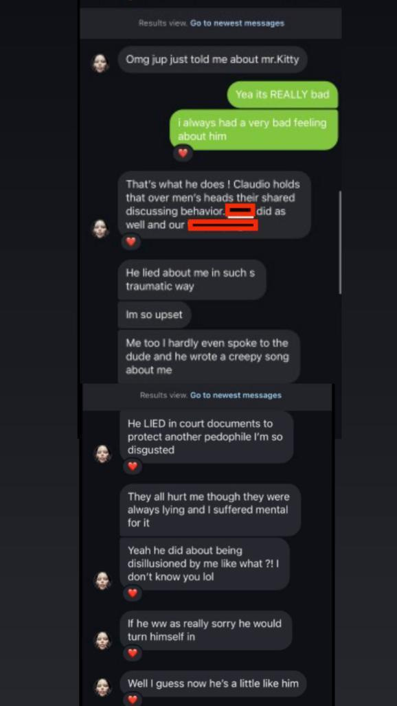 Whenever I’d talk to Alice she would constantly bring up Crystal Castles, out of nowhere during a converstation about Mr. Kitty she slandered the names of Crystal Castles’ crew-members by labelling them as people who are also abusive towards women, or so Alice claimed. Although the contradicting thing about this claim is, Alice told me before that she attempted to get these same 2 crew members to become a part of her team on tour with her, but they declined the offer. If this information about the crew members was true than why would she have even considered recruiting them at one point? what could’ve possibly made her come to this conclusion after they denied to join her on tour other than Jupiter, the same person who frames anyone that opposes him as “evil”, these are people that Alice was close with for nearly her entire life and wanted to reconnect with after leaving Crystal Castles yet it’s suddenly news to her that they’re allegedly abusers. As shown in the beginning, Alice speaks about Jupiter breaking the news to her about Mr. Kitty being outed as a p*dophile, Jupiter is her source of news as everything is filtered and/or read to her by him.