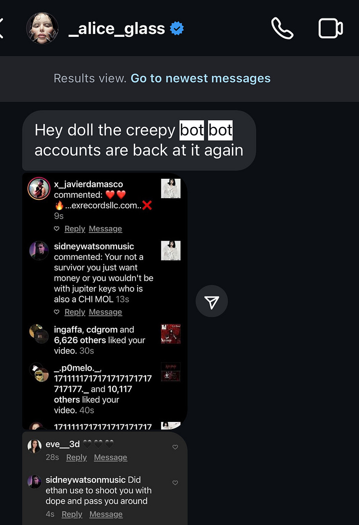 Something I became suspicious of was that Alice would constantly message me about pro-Ethan accounts leaving negative comments about her, at times I'd be directed to the post with the expectation that I would go and fight with Ethan's supporters in her defense. These expectations became exhausting because really the only thing it could lead to was more drama but it was subconsciously put into my head that by not advocating for Alice - I was complicit in her allegations, and abuse in general, not being taken seriously.