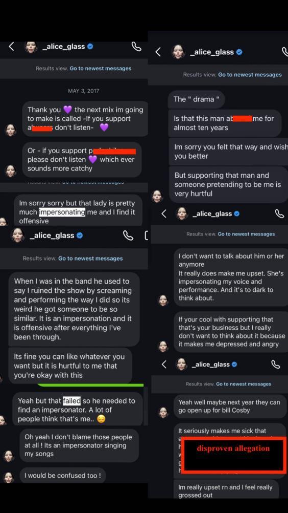 Because Alice disliked edits of herself being posted alongside edits of Edith, I created an Edith fan-page titled “edithpractice” to seperate them. I eventually told Alice that I moved my Edith edits to a different page to seperate the Crystal Castles eras from each-other but she was offended by this decision and said that I should consider running an Alice Glass page instead, so by Alice’s suggestion I created an Alice Glass fan-page by the username of “fetus_fatale”. I continued to post edits of the band leading up to May 2017 until the edits of Amnesty era Crystal Castles caught Alice’s attention which led to her aggressively messaging me to stop showing support for them, implying that I support p*dophiles while trying to villainize me for being a fan of Edith because Alice believed Edith was an “impersonator”. I would voice my opinions about Edith’s individuality to Alice so that I could try to open her mind to having compassion for Edith, but I was only met with repeated statements of Edith being an impersonator. As Alice used her emotions to manipulate my sense of empathy, I was put into a dilemma about who and what I could support without hurting others. I expressed that I felt very singled out because she was coming at me like this and that it was negatively impacting my mental health, she wished me the best but continued messaging me anti-Edith messages even after I asked her to stop. I felt so conflicted to delete my Crystal Castles page so I renamed it to “femenchoir” while I thought things through but ended up deleting it shortly after Crystal Castles had resposted my edit on their official page - sadly this triggered me to delete everything in support of them as Alice had ruined this special moment for me since I was made to feel horrible for supporting Crystal Castles without her in it.
